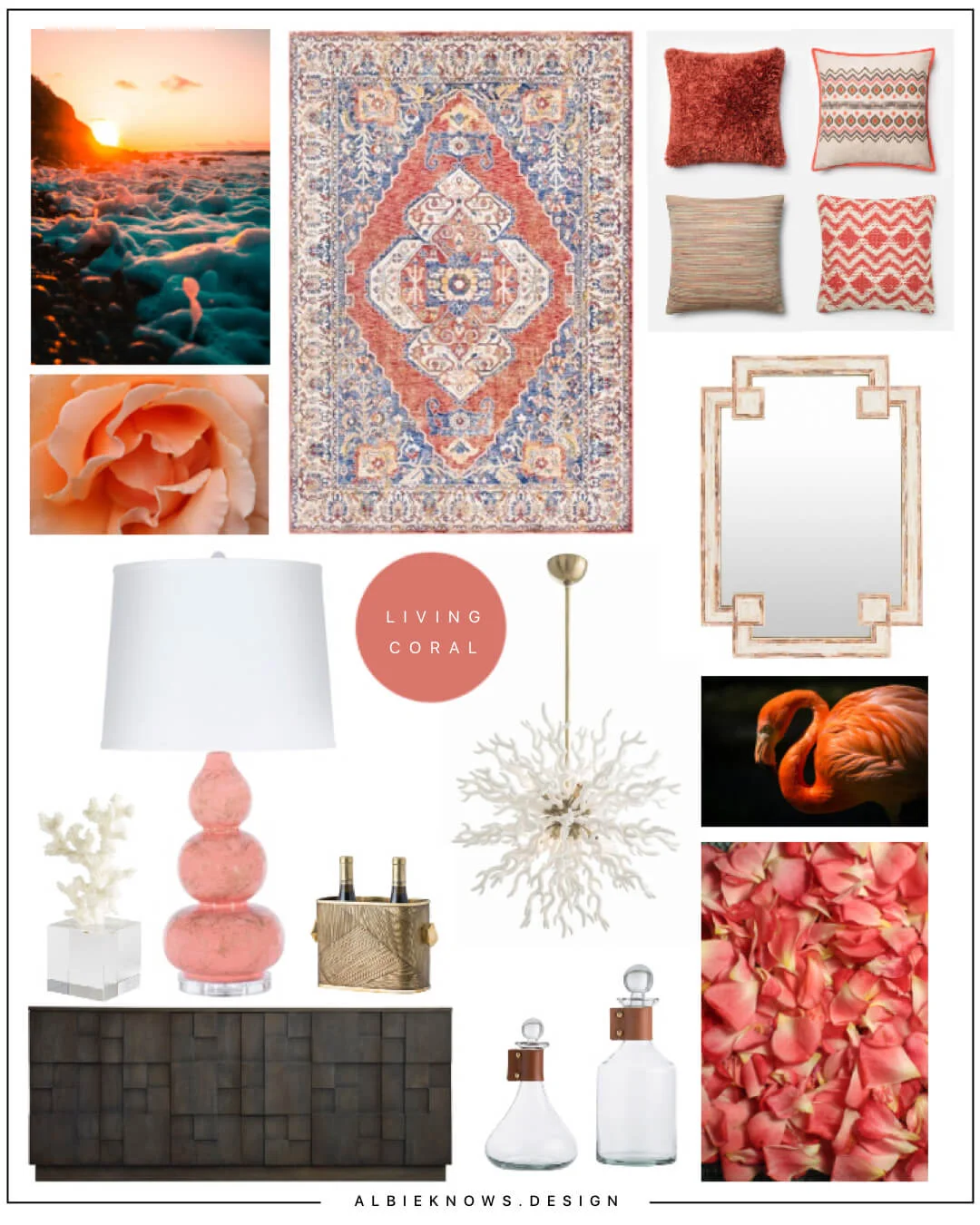 Living Coral shows up beautifully as an accent color — be it as the color you thread throughout the design or the fun pop to break of a palette of neutrals. In this way you could really play with bringing it into your space as a rug, decorative accent, mirror, throw pillow, lighting, and/or occasional seating.